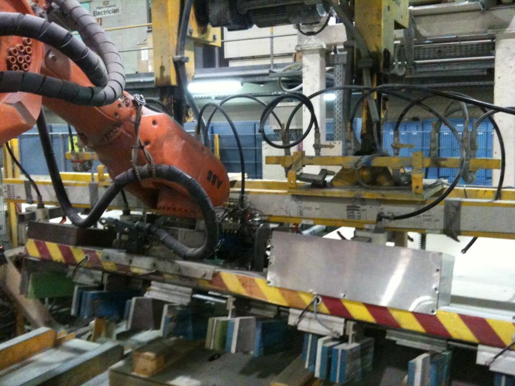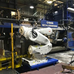 To reduce downtime, Applied Robotics developed a flexible Robotic solution with a unique Gripper to ensure that the Billet is correctly placed every time. This Gripper can withstand temperatures over five hundred (500) degrees Celsius and work within the constrained space between the Billet Ram and Extrusion Furnace within the Extrusion Press.